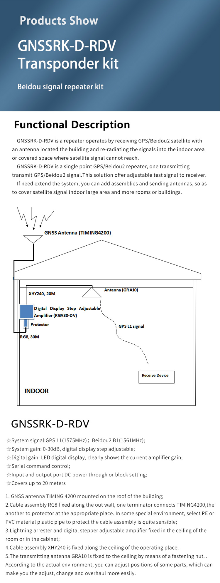GNSSRK-D-RDV is a repeater operates by receiving GPS/Beidou2 satellite signals with an antenna located outside the building and re-radiating the signals into the indoor area or covered space where satellite signal cannot reach.