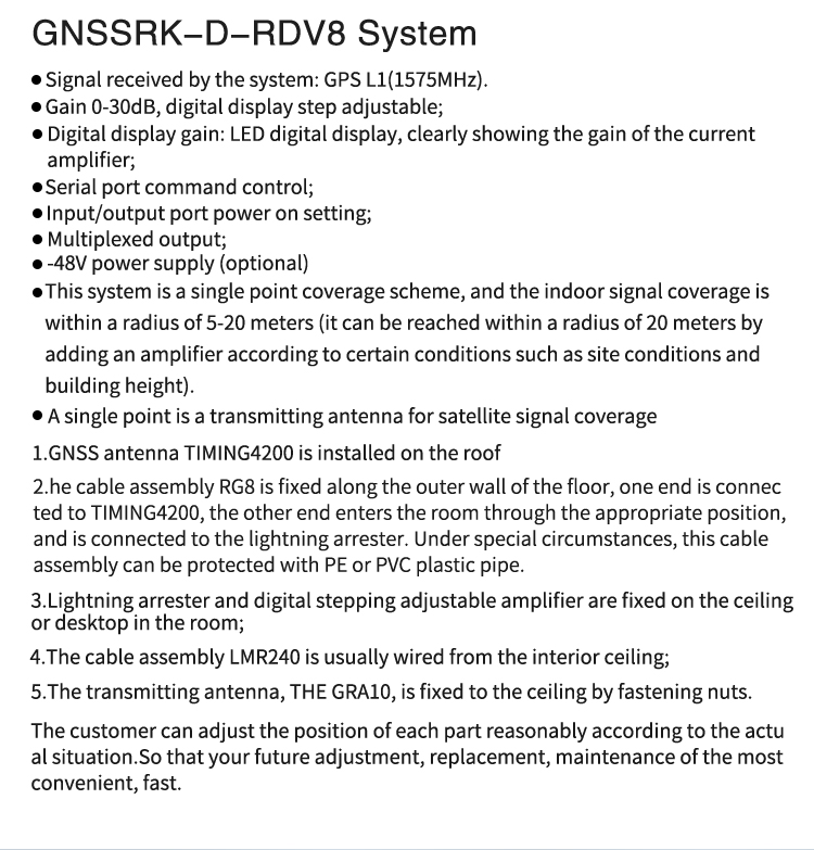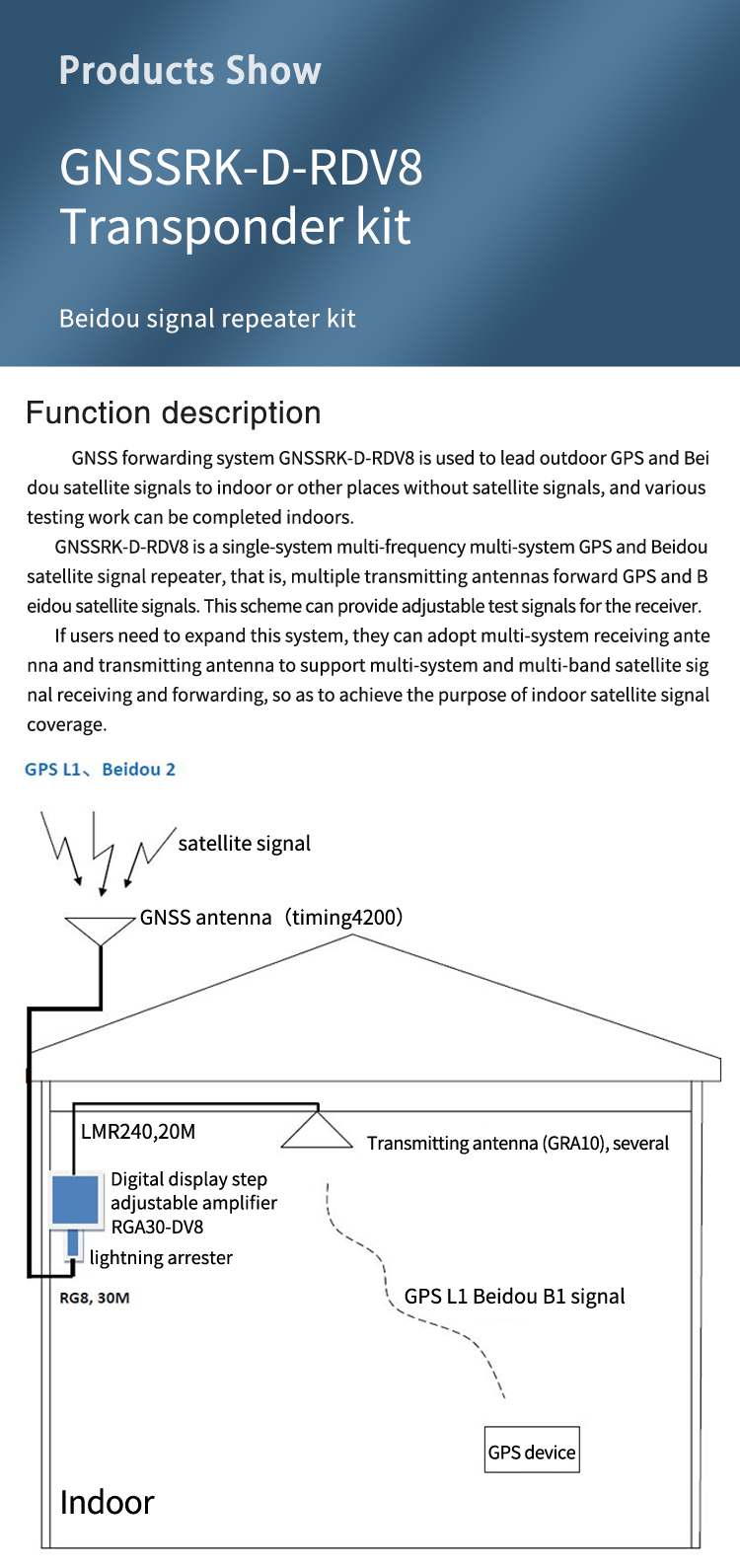 GNSSRK-D-RDV8 is a GNSS repeater operates by receiving GPS/Beidou3 satellite signals with an antenna located outside the building and re-radiating the signal into the indoor area or covered space where satellite signal cannot reach.