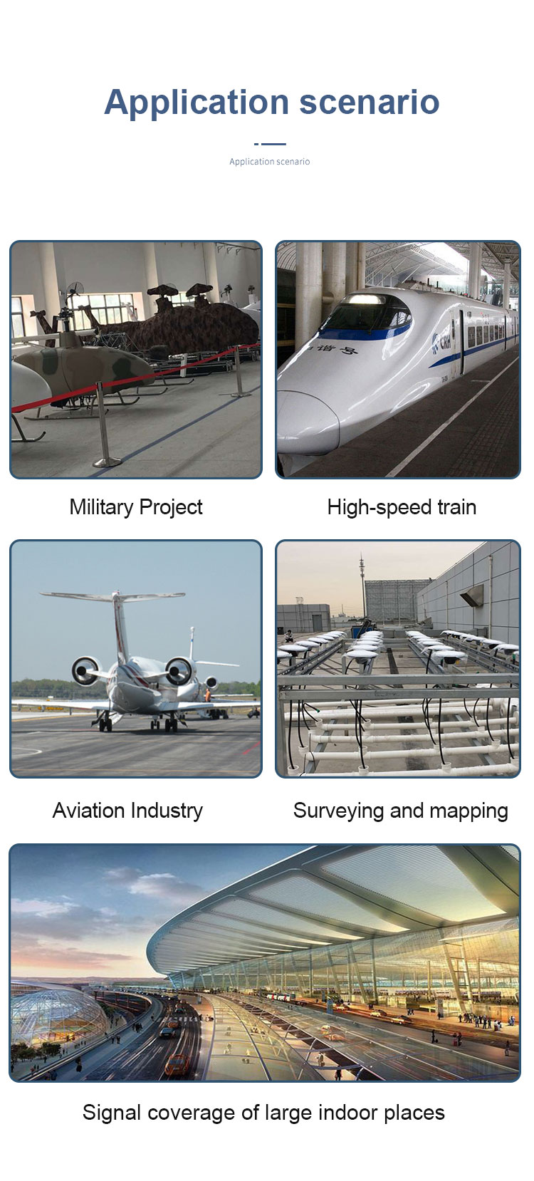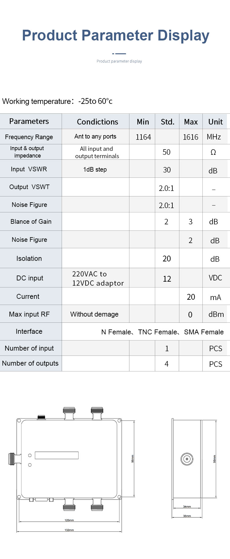 GA60-DV4 is an active GNNS amplifier with one end input and four port output ports. The signals received by the active GPS receiving antenna are evenly divided into four outputs for other receiving devices. IN such an application, the IN terminal can be configured with 5V DC to power the active GPS antenna connected to the port for operation. The other output ports will have a 200 Ohm DC load to simulate the DC loss of any receiver antenna connected to these ports. The device can control the desired gain and attenuation values using the 485 protocol. The maximum adjustable gain is 30dB.
