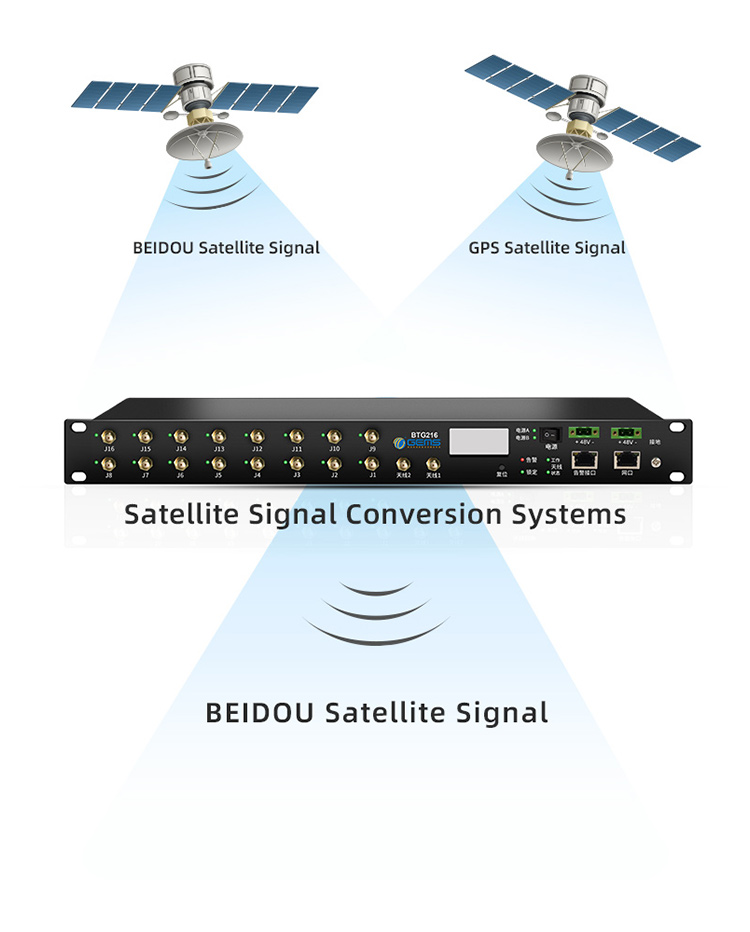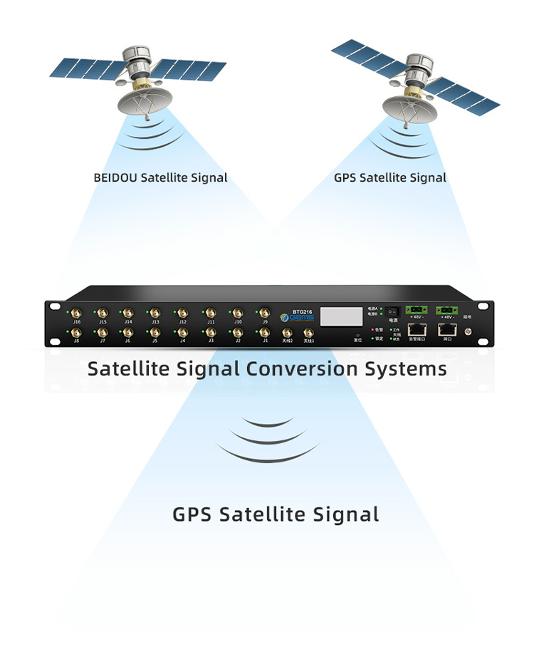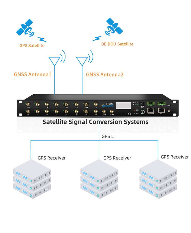 BTG216 satellite signal conversion system is a device with one input and 8/12/16 outputs. The input port is connected to GNSS receiving antenna, and the output port provides converted GPS L1 signals to 8/12/16 ports at the same time.