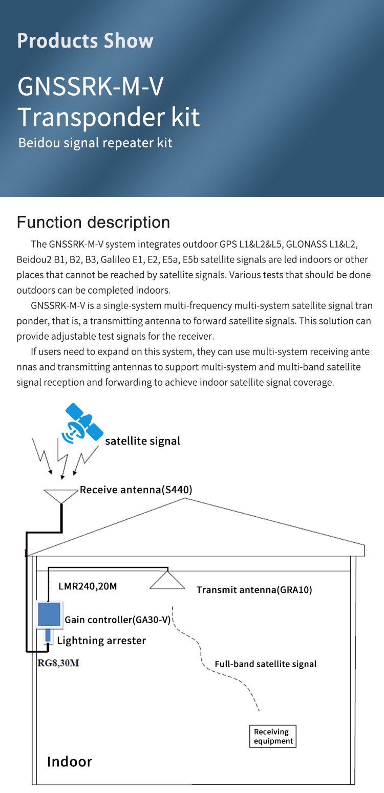 GNSSRK-M-V is a repeater operates by receiving full GNSS band signal: GPS/GLONASS/Beidou/Galileo/IRNSS/QZSS/SBAS/NAVIC with an antenna located outside the building and re-radiating the signals into the indoor area or covered space where satellite signal cannot reach.