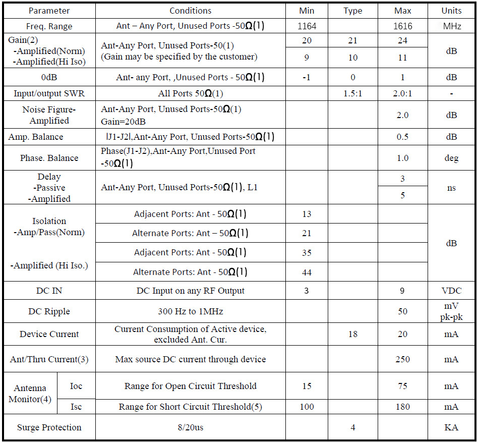 Note: (1) Note that proper RF performance, the GS14i must have all RF ports terminated into a 50 ohm coaxial cable system or a 50 ohm load.