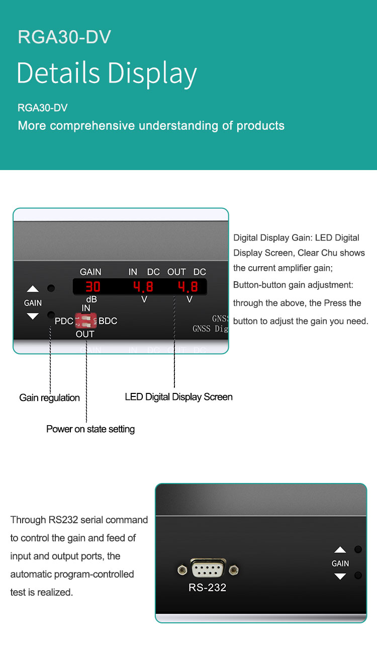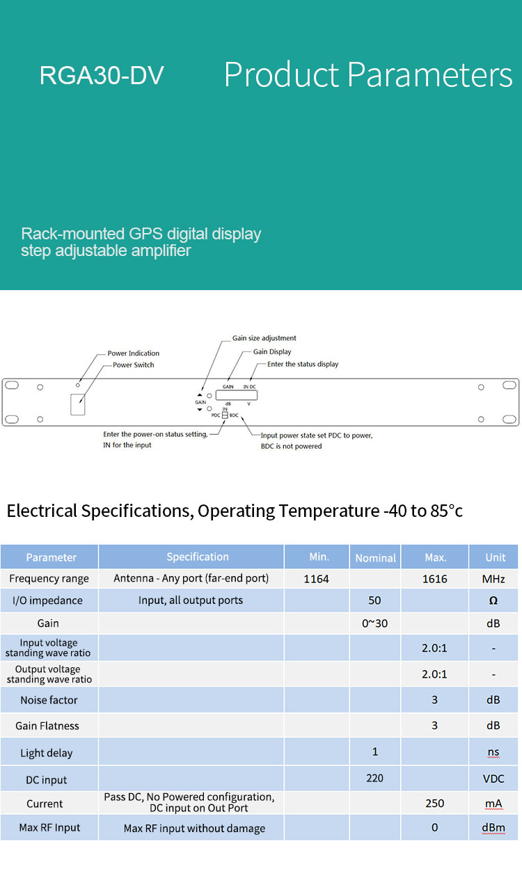RGA30 – DV8 is our latest rack‐mounted single stage of the low noise amplifier, its technical characteristics are as follows: