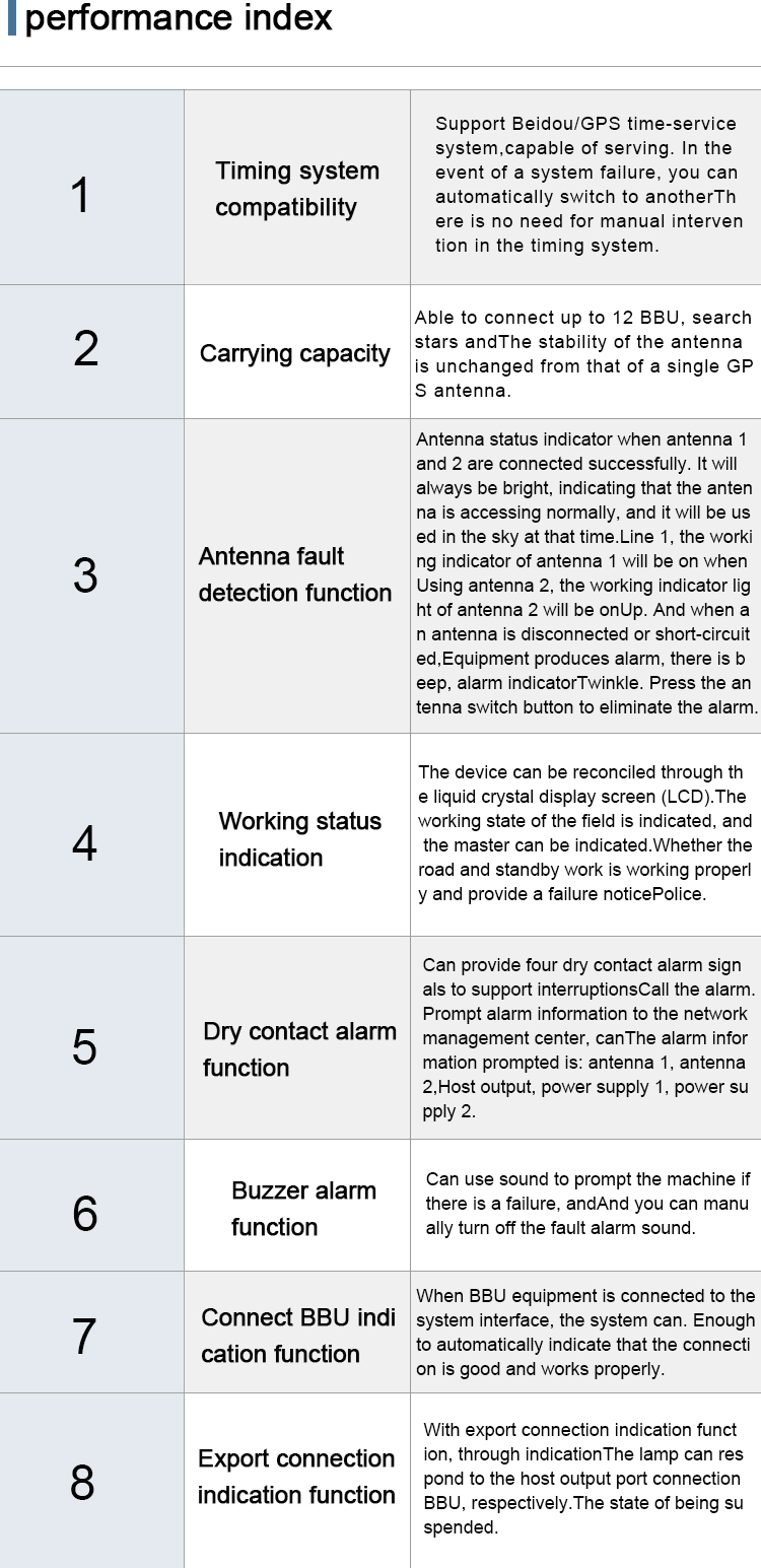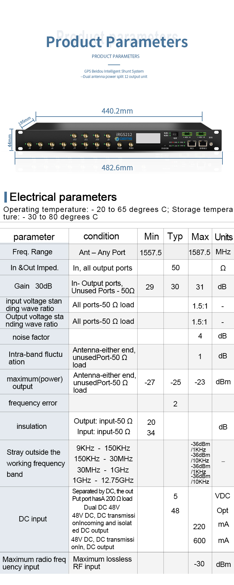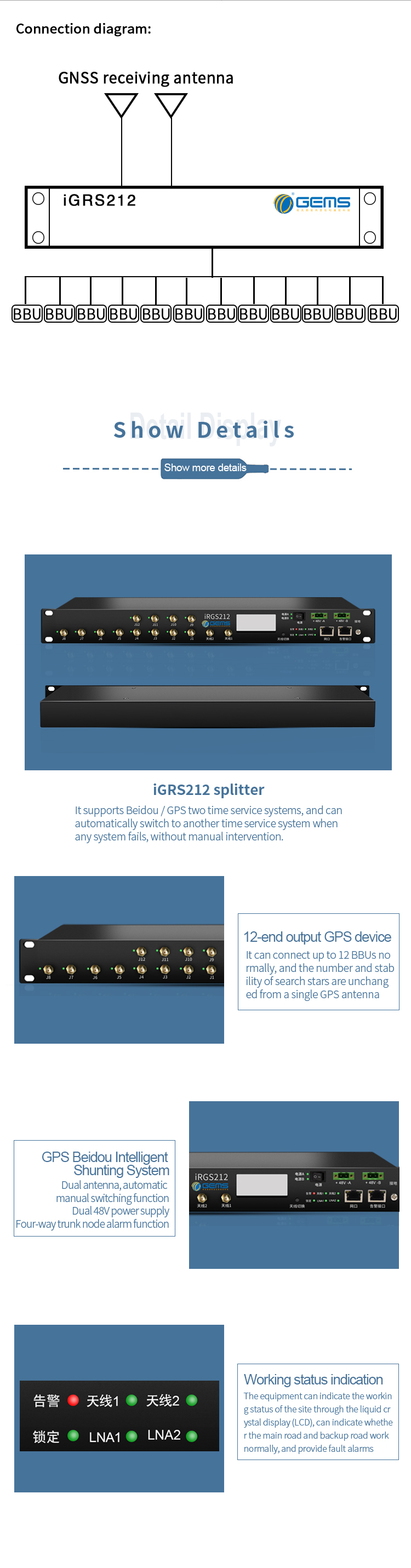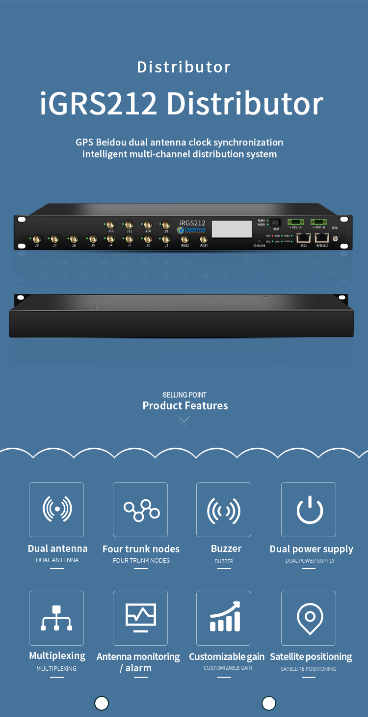 iRGS212 is a GPS distribution system with 2 input ports and 12 output ports. The dual input interface connects two GPS receiving antennas, and the output port provides GPS signals to 12 ports at the same time. IRGS212 distributes the signal received by the active GPS receiving antenna to 12 channels on average, and supplies it to the BBU devices(or other GPS devices).