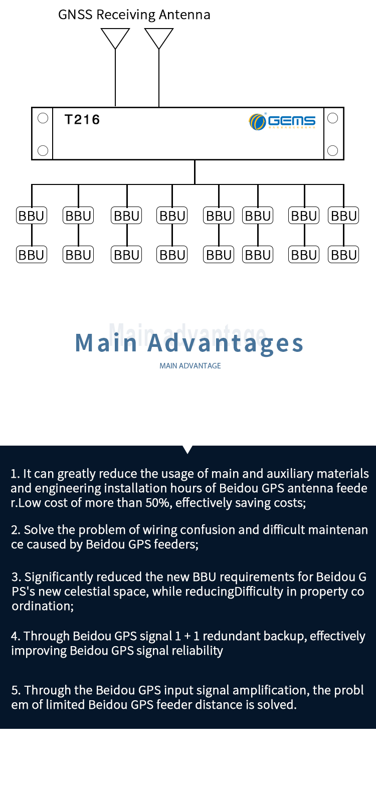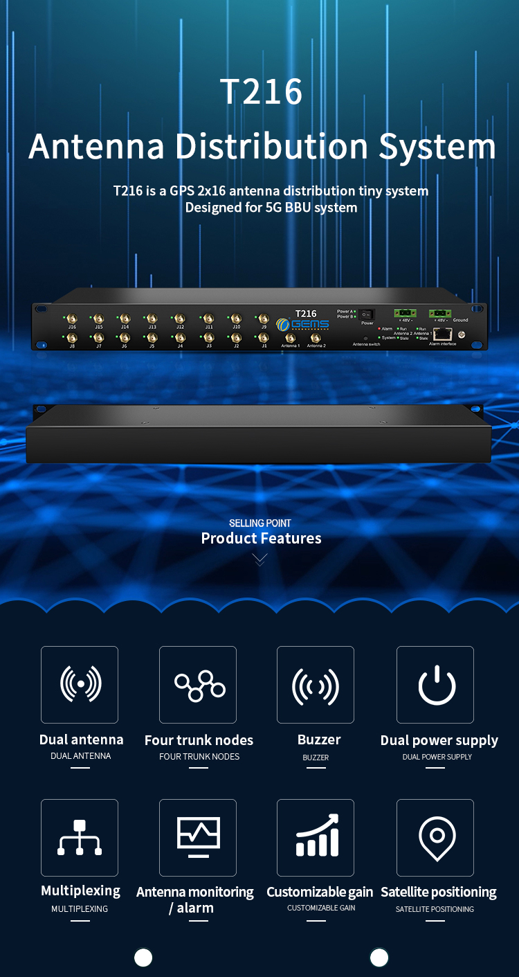 T216 is a GPS 2x16 distribution tiny system, low power consumption, simple system without network management system, it supports dual antennas input and 16 ports output for BBU system . Sharing the two GPS timing antennas. T216 is a splitter system for sharing gps antenna for 5G BBU systems. The T216 supports dual 48V DC inputs. Supply 4 ways dry contact outpouts. Designed for 5G BBU system.